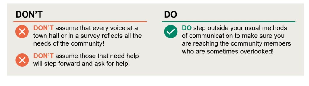 3. Engage and empower stakeholders: To address a community’s unique needs, it is important to involve the community in policy and program decision-making, listen to their needs and work with them to develop a plan that meets those needs. Conduct listening sessions to collect information about the community’s specific experience and provide opportunities for stakeholders to take on appropriate leadership roles in emergency management programs. Involving community members throughout the disaster lifecycle will support an equitable emergency and disaster management approach.