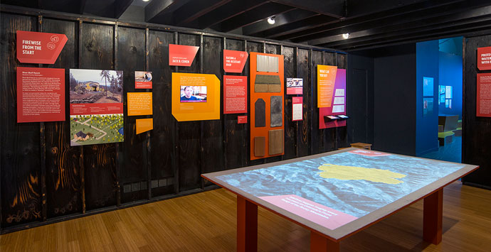 So how did we keep the focus on the positive? By presenting dozens of successful, domestic case studies — new and old — that show how individuals, nonprofits, private entities, communities, and federal agencies are addressing threats from all types of natural hazards (i.e., earthquakes, tornadoes, hurricanes, wildfires, flooding, storm surge, and sea level rise). And just as the design of each gallery evokes a specific hazard, it also points the way to various mitigation strategies and solutions. The water gallery was particularly tricky — but one of the inspirations for its design was ArchTam’s work in Blackpool, United Kingdom, where a reimagined promenade was integrated with coastal defenses. The Blackpool project celebrates the water’s edge and Designing for Disaster also suggests this approach.