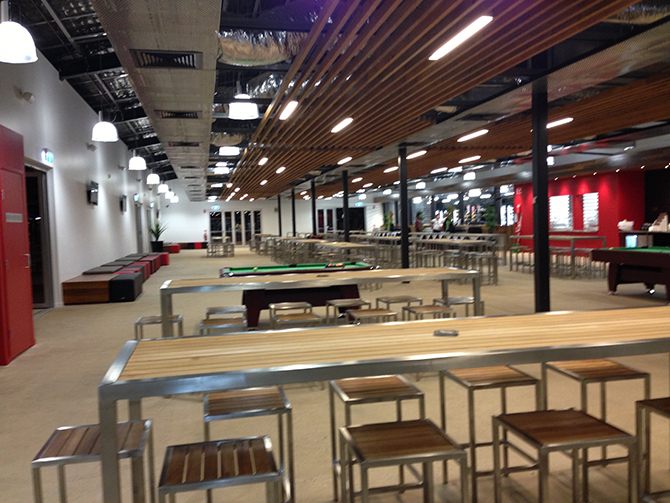 I enjoy a quality meal in the dining facility fit for 1750 people. Wow, this place is great!. The compartmentation of areas and varied seating works well. Industrial lighting and recycled rubber floors are softened with the warmth of wood panels and screens, and the coloured chairs set the place off.