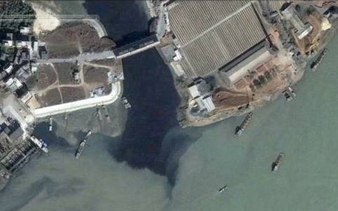 Aerial shot of denim and dyeing facilities polluting China’s Pearl River.