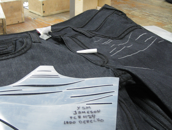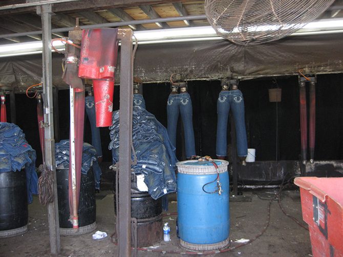 Jeans are slipped onto inflatable rubber legs and sprayed with potassium permanganate to produce a fading effect.