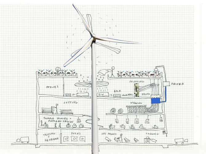 Diagram of Denim Factory by Cathy Pack. Cotton is grown on the roof and thrown down a chute where a wind-turbine-powered cotton gin separates the fibers from the seed. It is spun and dyed, the wastewater treated and used to water the cotton. After being woven and cut, it gets sent to the sewing floor, and from there, processed and shipped out.