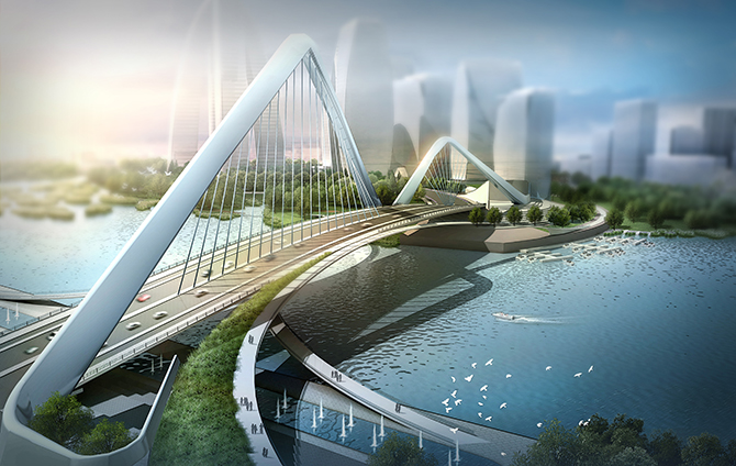 The site is located at the confluence of four rivers; the design calls for two bridges along an arterial loop road connected with a waterfront promenade and park. The key design drivers were pedestrian connectivity and access from the central business district and adjacent neighborhoods to the waterfront for recreational activities. The two bridges include programmed space where the structure meets the landscape; this becomes a transitional space where landscape becomes bridge and buildings become landscape, blurring the lines between the public realm and architectural elements.
