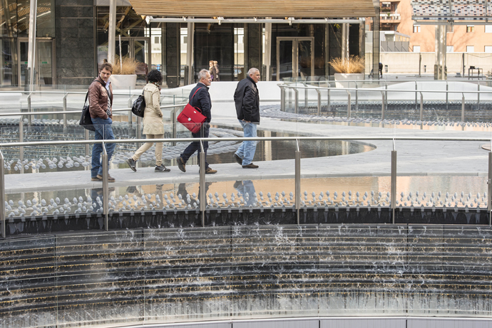 This designed environment, the Piazza Gae Aulenti in Milan, Italy, creates visual interest and attraction around passive ventilation measures for the sub-surface parking area below it.
