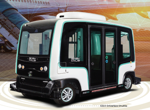 The shuttle pictured here from our partner EasyMile has no steering wheel and operates bi-directionally. It operates fully automated using several different techniques to understand its environment. Aviation market use cases include transport between car parks and terminals and transportation for staff, VIPs, luggage, freight and catering movement.