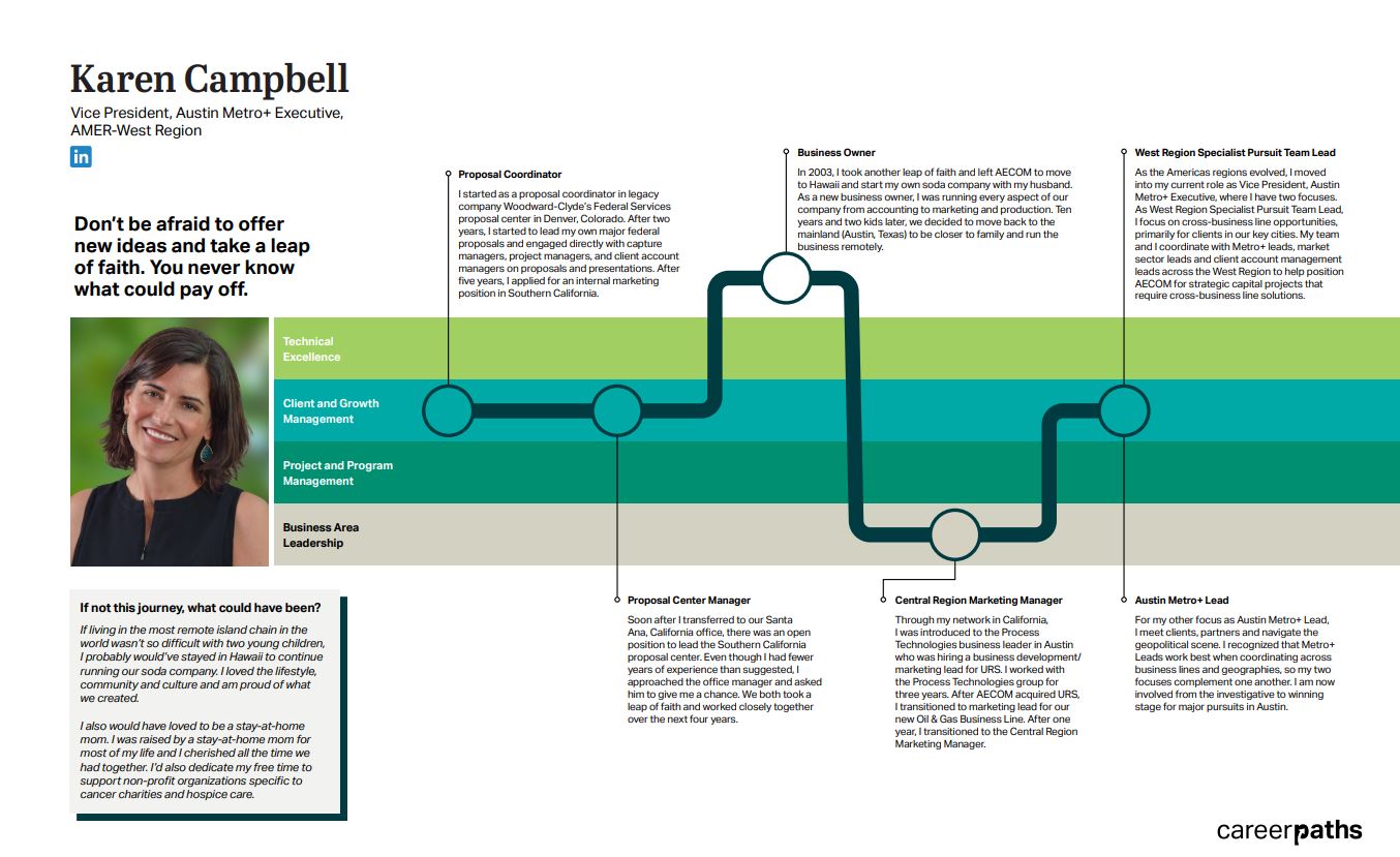 After I transferred to our Santa Ana, California office, there was an open position to lead the Southern California proposal center. Even though I had fewer years of experience than suggested, I jumped at the opportunity and approached the office manager to give me a chance. We both took a leap of faith and worked closely together over the next four years to create a winning proposal center.