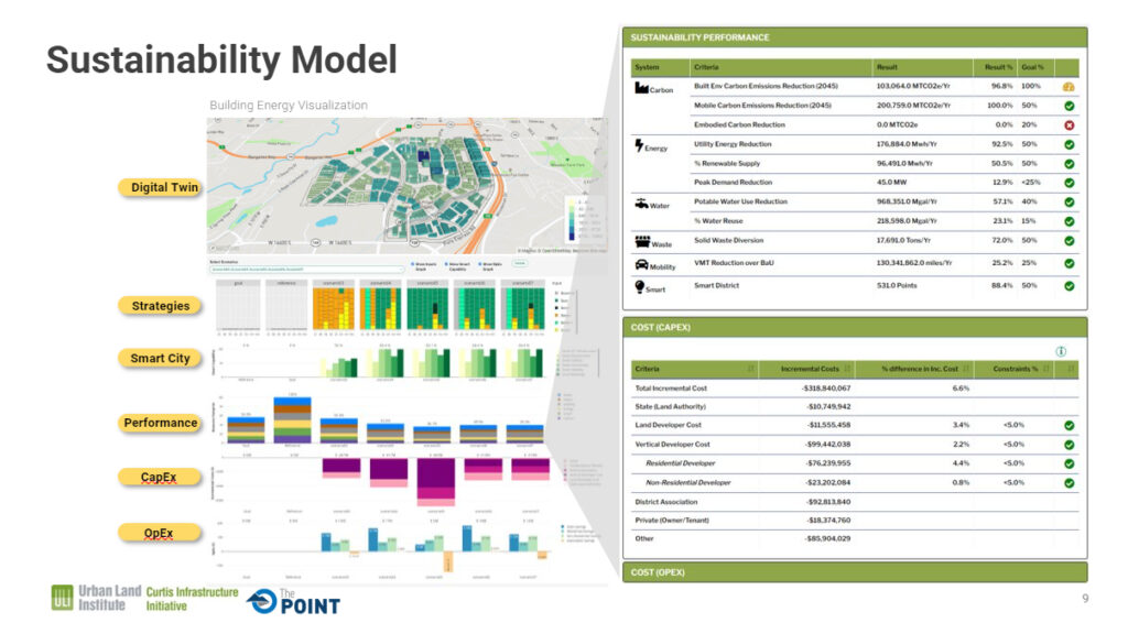 We developed a tool to help visualize the outcomes of the various scenarios while measuring the capital expenditures and operational costs tied to each scenario. The tool was a digital twin of the project that functioned like a game board where you can take any system — water, energy, transportation — and turn dials to include or exclude different types of strategies, such as rooftop solar or water reuse, and see the performance and the costs reported out in real time.