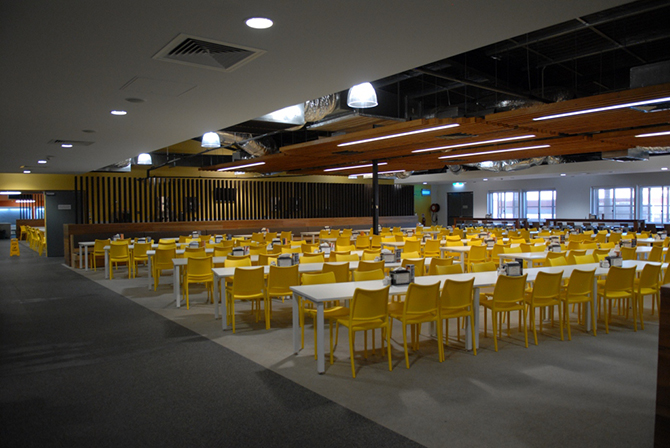 I enjoy a quality meal in the dining facility fit for 1750 people. Wow, this place is great!. The compartmentation of areas and varied seating works well. Industrial lighting and recycled rubber floors are softened with the warmth of wood panels and screens, and the coloured chairs set the place off.