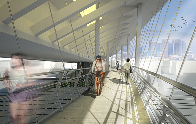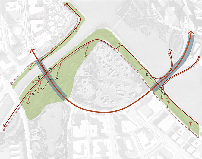 The site is located at the confluence of four rivers; the design calls for two bridges along an arterial loop road connected with a waterfront promenade and park. The key design drivers were pedestrian connectivity and access from the central business district and adjacent neighborhoods to the waterfront for recreational activities. The two bridges include programmed space where the structure meets the landscape; this becomes a transitional space where landscape becomes bridge and buildings become landscape, blurring the lines between the public realm and architectural elements.