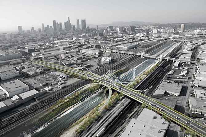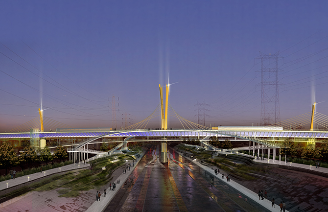 More recently we were shortlisted to one of three design teams for the Sixth Street Viaduct competition in Los Angeles, a highly visible competition that featured some of Los Angeles’s most respected architects. Constructed in 1932, the Sixth Street Viaduct (also known as the Sixth Street Bridge) is an important engineering landmark in the City of Los Angeles.  It is the longest of 14 historic Los Angeles River crossing structures. Located in a densely urbanized area just east of downtown Los Angeles, the bridge is a critical transportation link between the Los Angeles Arts District and Boyle Heights. A 1986 Caltrans bridge survey found it to be eligible for inclusion in the National Register of Historic Places; however the bridge must be replaced due to a form on “concrete cancer” that is rapidly eroding the structure.