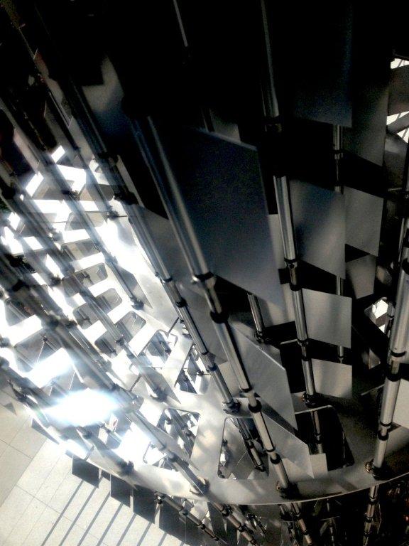 And speaking of art, two major public art pieces are especially effective. Four 60-foot “Air Columns” by artist Ned Kahn mark the building’s entrance, with hundreds of anodized aluminum vanes spinning and creating complex patterns in response to climatic conditions.