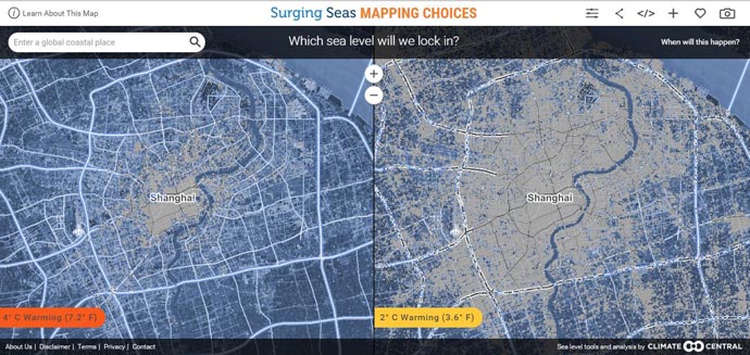 An historic agreement was reached in Paris on Saturday. One hundred and ninety-five nations agreed that we must reduce our greenhouse gas emissions and must work to keep the average global temperature rise to under two degrees Celsius (3.6 degrees F) from pre-industrial levels. Only one of the 196 nations attending, Nicaragua, objected on the basis that the agreement didn’t go far enough. At the strong urging of island states, the agreement also has an aspirational goal of keeping the increase under 1.5 degrees C, because, the island nations argue, many of them cease to exist with a rise in global average temps over 1.5. To understand graphically what these temperature changes mean to coastal cities, the research organization Climate Central has developed a tool called Surging Seas that compares the impact of different levels of temperature rise on coastal flooding.