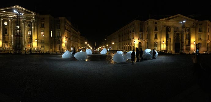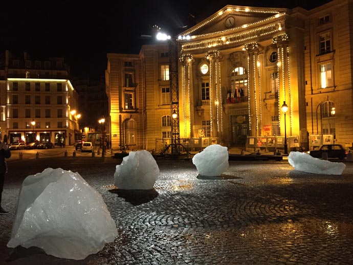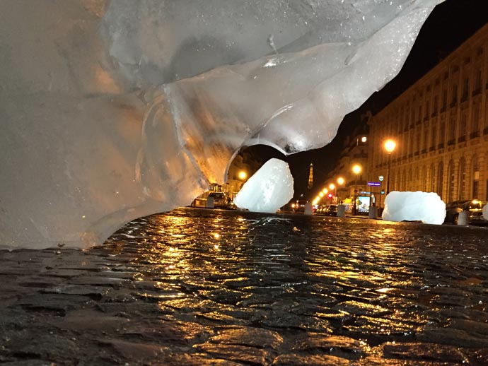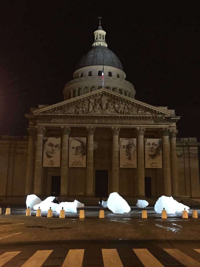 Twelve immense blocks of ice, harvested from free-floating icebergs in a fjord outside Nuuk, Greenland, were arranged in clock formation on the Place du Panthéon, to melt symbolically during COP 21.