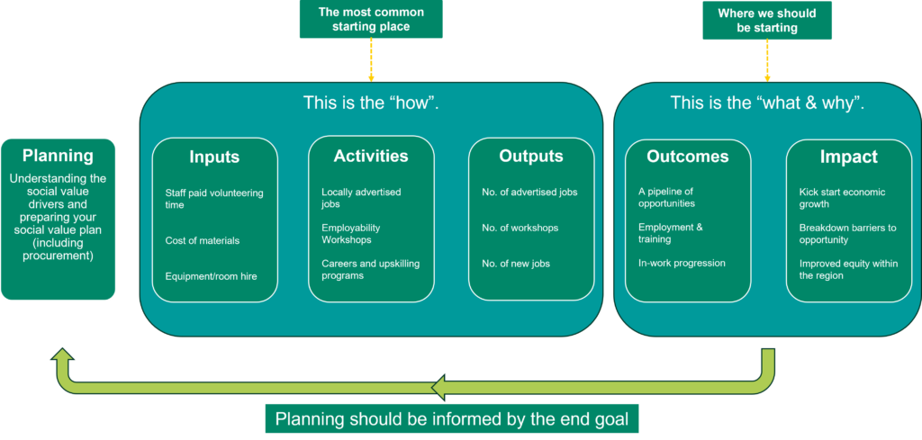 Too often, social value starts with the âhowâ â focusing on inputs, activities and outputs such as the number of apprenticeships offered or volunteer hours logged. Procurement frameworks frequently emphasise measurable commitments, making it tempting to focus on visible and easily quantifiable metrics rather than the bigger picture.