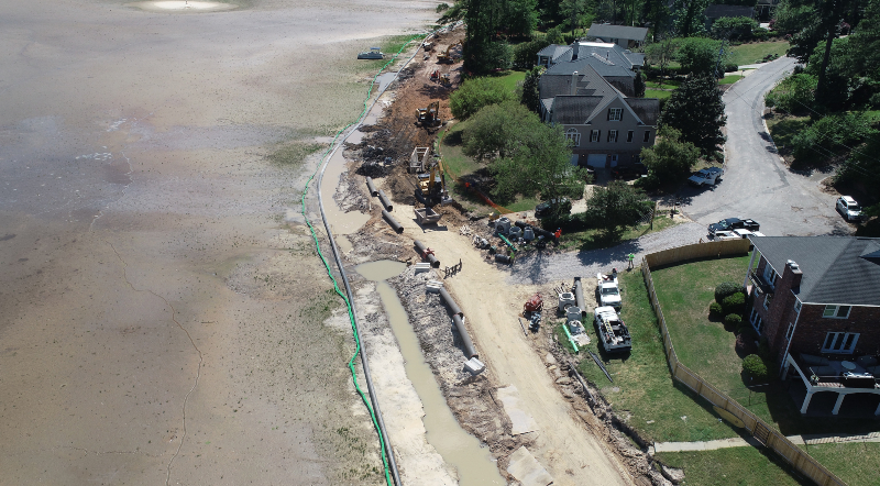 Lowering the lake level and building a temporary road were key in advancing the sewer line replacement.