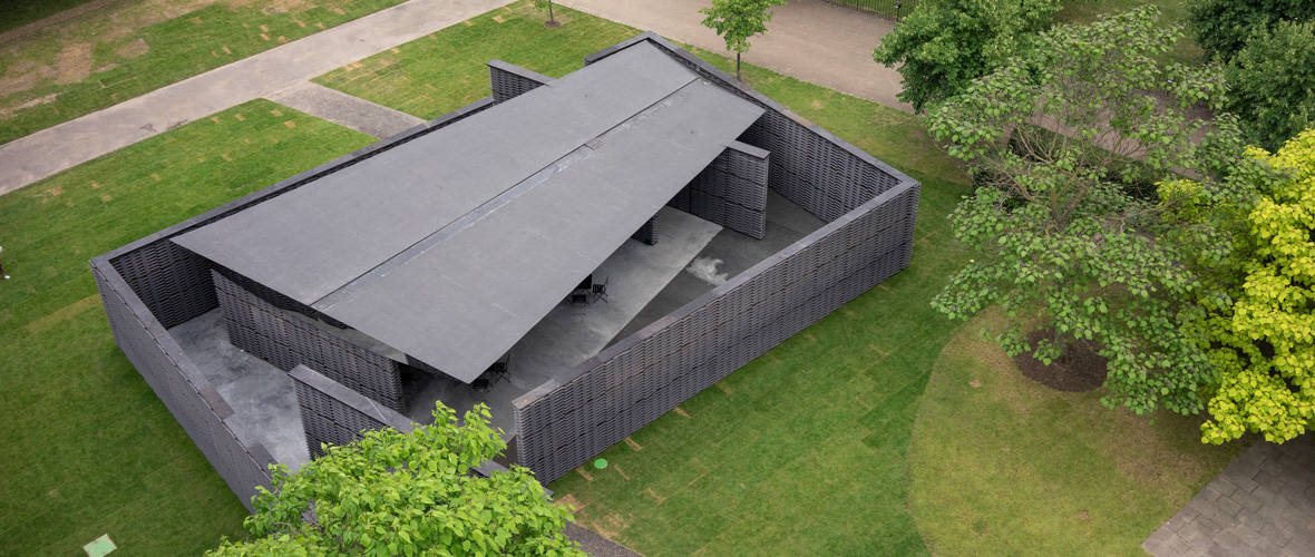 The concrete tiles — bespoke to the Pavilion — drove the early design process: the length of the manufacturing process required all key design principles to be agreed within the first two weeks of the 24-week programme. The tiles were fired with bespoke holes formed in the moulds, and were then stacked on steel rods and spacers to create the perforate walls.